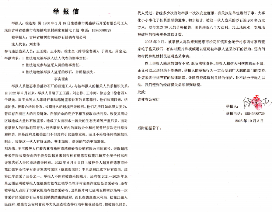 本站讯 近日,吉林省德惠市市民徐连海向吉林省及长春市相关部门递交实名举报信,直指榆树市洪福砂石销售有限公司(以下简称“洪福砂石公司”)自2022年5月起长期越界非法盗采砂石,不仅破坏生态环境、扰乱市场秩序,更导致当地合法企业濒临破产。徐连海在举报信中提供了卫星云图、现场视频等多项证据,并恳请相关部门启动异地管辖调查,依法追究涉事人员责任。